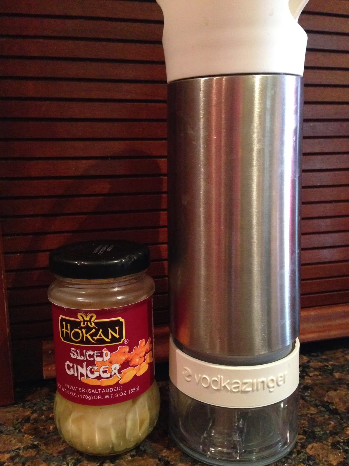 Ground ginger + 1 shot Absolut Vodka (or Vodka of choice) in shaker with four ice cubes
