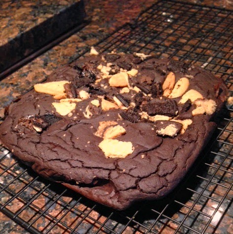 Preheat the oven to 350 degrees Fahrenheit. Line a 9×9 pan with parchment paper. Throw all cake ingredients in a blender (including 3 of the six oreos) and mix well! Pour into pan lined with parchment paper. Crumble three remaining oreos and sprinkle on top. Put in the oven for 30 minutes or until a toothpick comes out clean. Remove and allow to cool completely on a wire rack like pictured below.