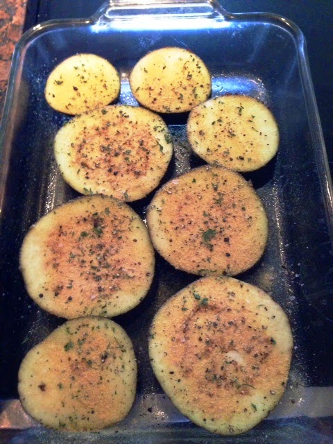 Preheat the oven to 375 degrees Fahrenheit. Lay eggplant in a sprayed or parchment paper lined baking pan. Spray with olive oil spray on both sides and top with salt, pepper, and garlic powder. It should look like the picture below. Heat in the oven for 20-25 minutes.